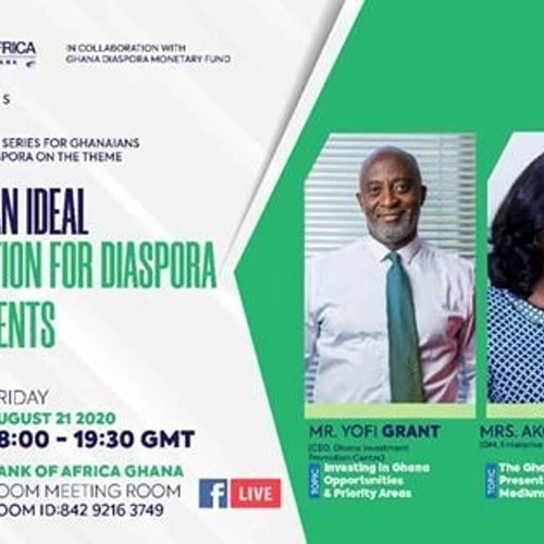 Join our CEO and BANK OF AFRICA Ghana on Friday 21st August 2020 at 18:00 GMT to get more information on investment opportunities in Ghana and priority areas post Covid for the diaspora community.