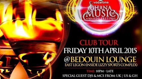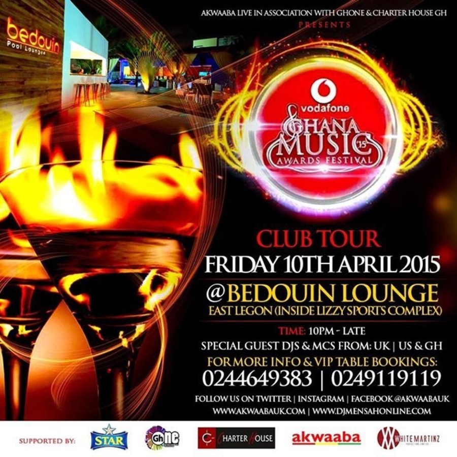 The 16th Annual Vodafone Ghana Music Awards coming SOON!... ... as akwaaba_uk in collaboration with Ghone, white martinz and raging bull brings you the VGMA CLUB TOUR! The event starts from 10th and ends on 12th of April @ Bedouin lounge #VGMA.
