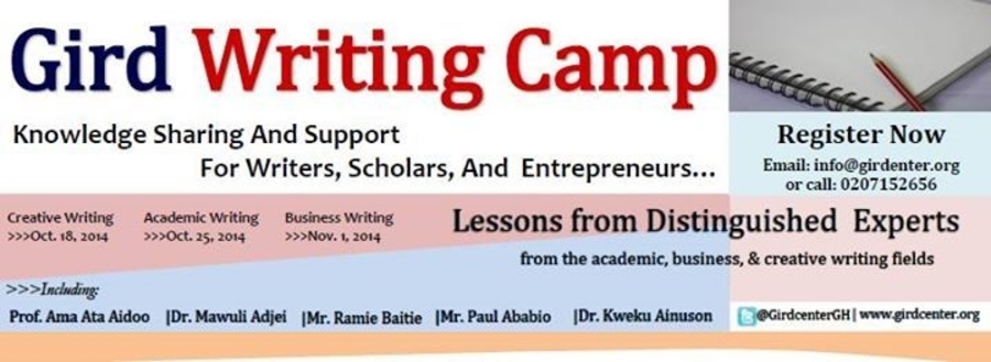 The Gird Writing Camp is a two-tiered interactive writing program that seeks to help young writers, scholars, and entrepreneurs develop and enhance their writing skills. The Camp comprises a one-day intensive seminars in Creative Writing, Academic Writing, and Business Writing and a month long writing consultancy package for participants.
