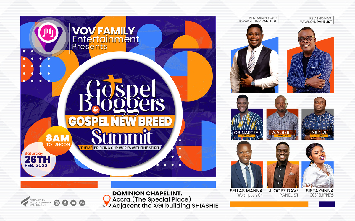 The much anticipated event, which comes on February 26, 2022, is the inaugural convention of bloggers, digital influencers and emerging gospel musicians. The aim of the summit, hosted by VOV family entertainment, is to network, learn and share knowledge about the gospel music industry in Ghana.