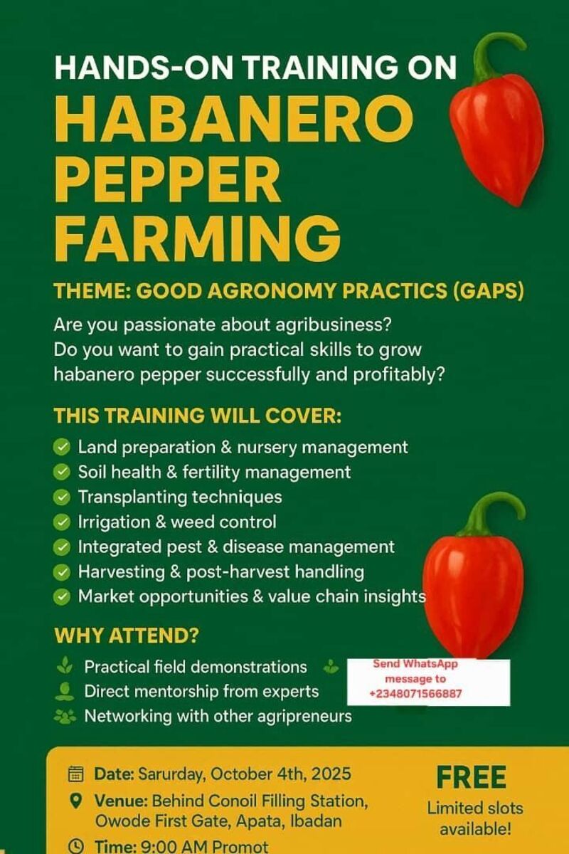 Join us for an engaging and practical workshop designed to equip aspiring and experienced farmers with essential skills in habanero pepper cultivation. This event is powered by Horti Nigeria and in partnership with FarmEasy Hub. Discover best practices in land preparation, soil health, transplanting, irrigation, pest and disease management, harvesting, and market opportunities. Gain direct mentorship from seasoned experts and network with fellow agripreneurs. Whether you're looking to start or scale your habanero farming business, this training offers valuable insights to ensure success and profitability.
