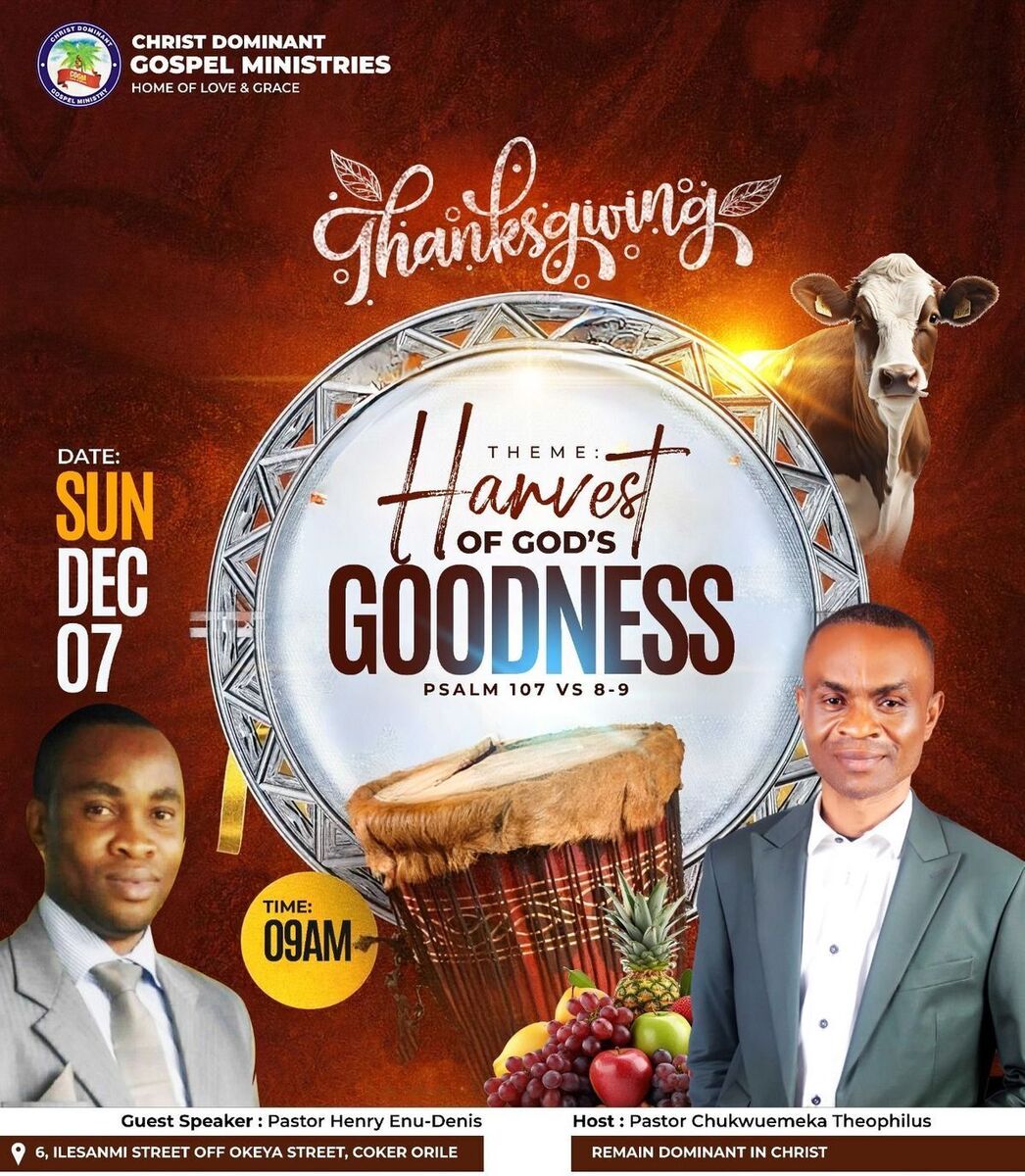 π Join us for a soul-lifting celebration of gratitude and divine blessings at HARVEST OF GOD's GOODNESS! This annual thanksgiving event is a vibrant gathering where brethren come together to give praise, share testimonies, and bask in God's abundant goodness. Expect powerful worship, inspiring sermons, and a warm atmosphere filled with joy and fellowship. Come with an open heart and be ready to be blessed beyond measure! πβ¨