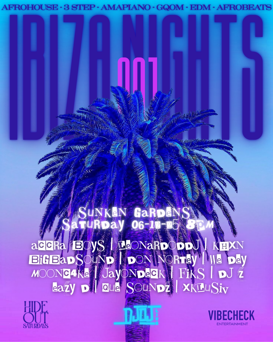 Step into the spirit of the White Isle as DJ OJ transforms Sunken Gardens into an Ibiza-inspired paradise. The party kicks off at 8 PM—expect deep house rhythms, amapiano log drums, glowing ambiance, and a night of pure escape.
