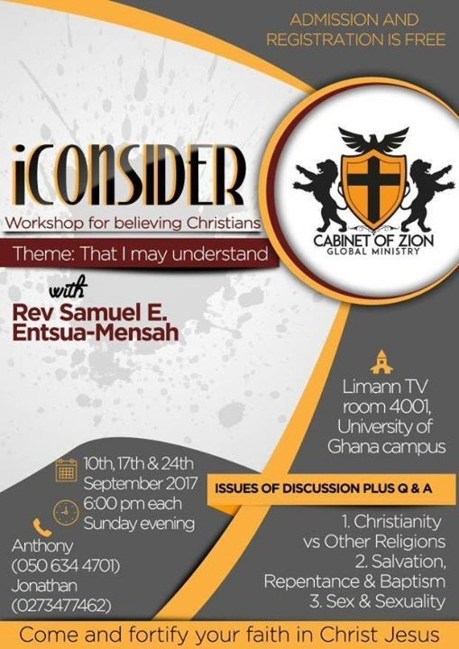 iCONSIDER as a three Sunday event (i.e. 10th, 17th & 24th September) seeks to tackle the various frustrations a 'thinking-Christian' goes through in his/her mind. After a detailed exposition to the issues listed (i. Christianity versus other religions, ii. Salvation, Repentance and Baptism & iii. Sex and Sexuality) has been given by Rev S E Entsua-Mensah the platform would be given to the audience to ask any and every question that troubles them or that makes them doubt the Christian faith. The iCONSIDER team and Cabinet of Zion Global Ministry believes that our faith with its beliefs makes a lot of sense. Blessings.