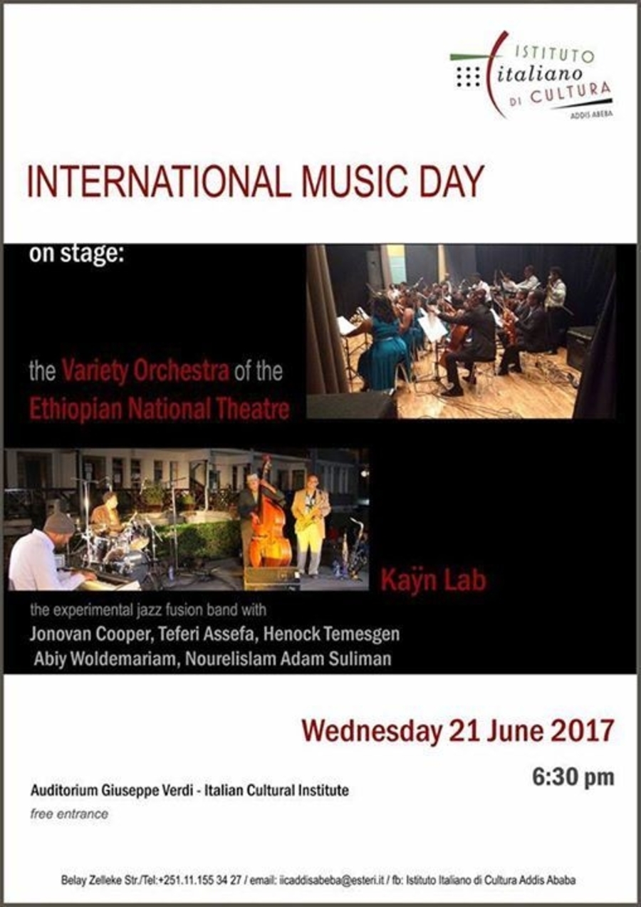 On the occasion of the International Music Day, the Italian Cultural Institute (Istituto Italiano di Cultura Addis Abeba) is organizing a concert by having on stage the “Variety Orchestra” of the Ethiopian National Theater and the experimental jazz fusion band “Kaÿn Lab”.