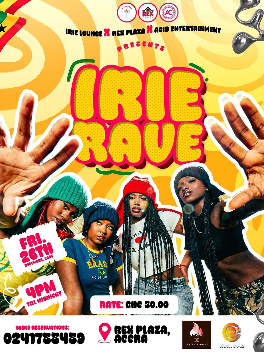 We're setting the stage for Irie Rave this December π₯ Join us from 4pm to 2am on December 26, 2025 for the biggest rave in East Legon!
