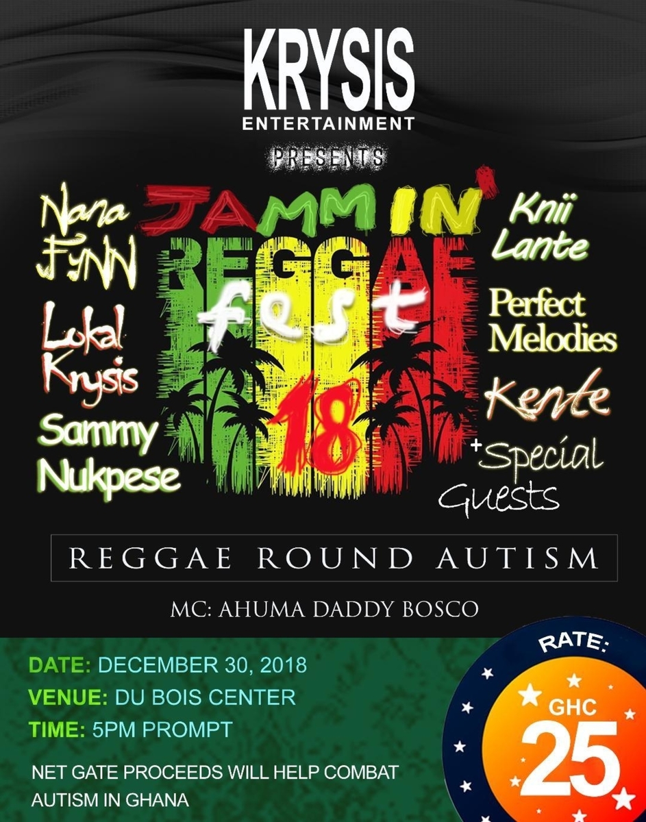 Krysis Entertainment/Krysis Musique Inc. in partnership with Autism Ambassadors of Ghana presents Jammin’ Reggae Fest 2018 concert to be held at the W.E.B Dubois Center in Accra on December 30, 2018 from 5pm to 11pm. This year’s concert is the first in a series of music entertainment initiatives planned by Krysis Entertainment/Krysis Musique Inc. to unearth and showcase roots reggae musical talents in Ghana and the rest of Africa, for purposes of grooming them musically and professionally to global success and stardom. The concert will feature some of the best known and available performers of reggae music from Ghana (see attached flyer). More importantly, the concert and other planned events for the future, are intended to facilitate greater awareness of autism and the plight of children with the developmental disability in Ghana.