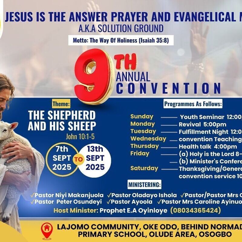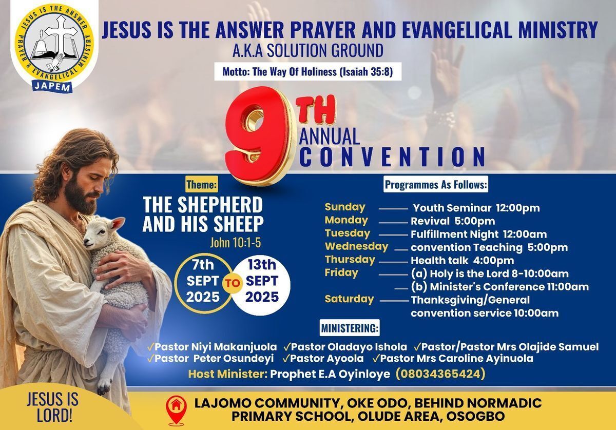 Join us for the 9th Annual Convention organized by Jesus Is The Answer Prayers & Evangelical Ministries (JAPEM). This inspiring event features a powerful theme: "The Shepherd And His Sheep", based on John 10:1-5. Engage in a day of spiritual growth, fellowship, and impactful messages designed to uplift and empower attendees. Whether you're seeking spiritual renewal or community connection, this convention promises a memorable experience. Don't miss the opportunity to be part of this significant gathering! ๐๐