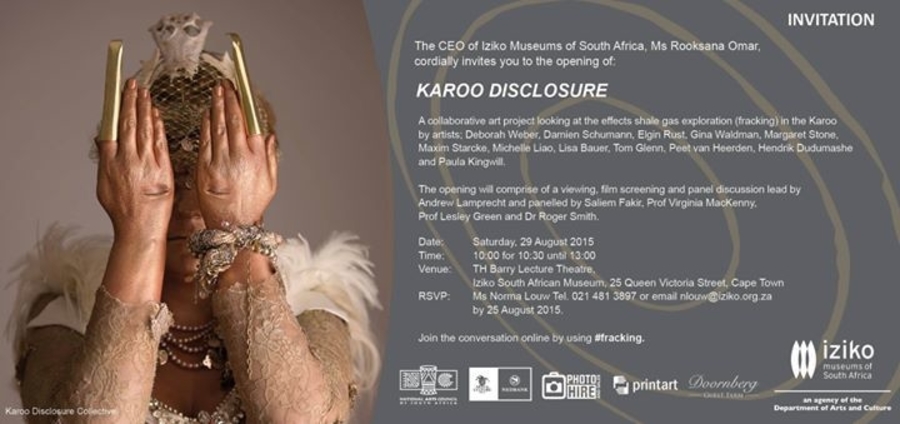The opening of the Karoo Disclosure exhibition on Saturday, 29 August 2015 at the Iziko South African Museum, will feature a viewing, film screening and panel discussion lead by Andrew Lamprecht and panelled by Saliem Fakir, Proof Virginia MacKenny, Prof Lesley Green and Dr. Roger Smith.