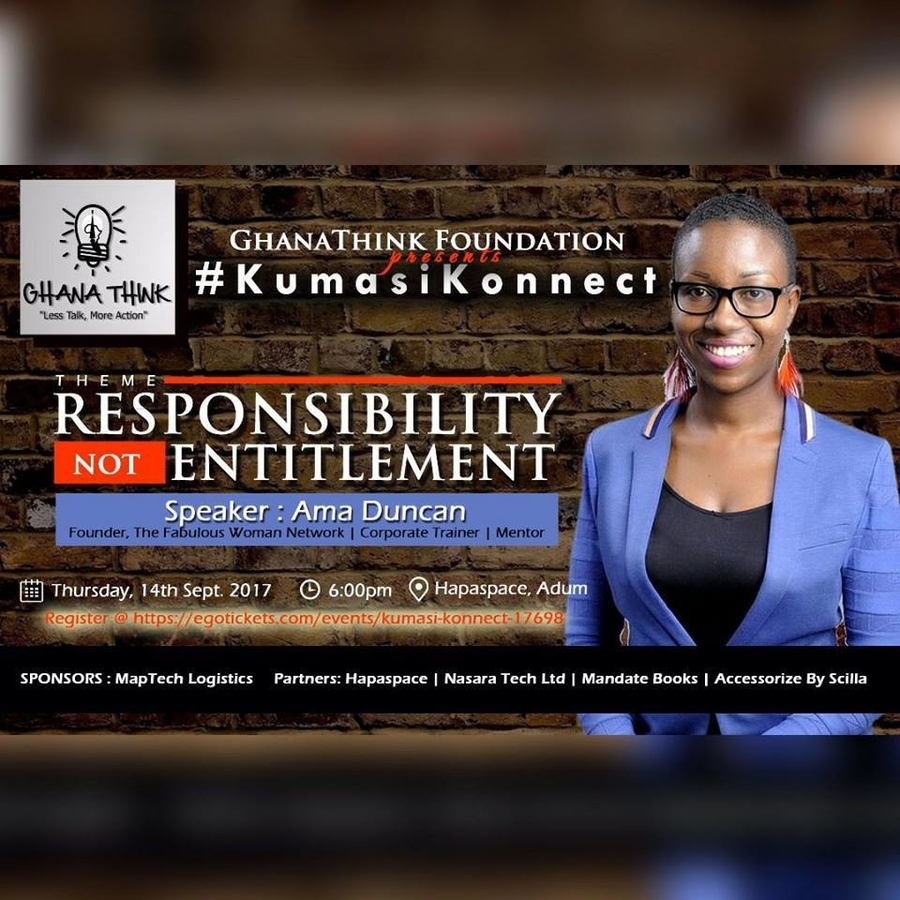 The 9th Edition of Kumasi Konnect will feature Ama Duncan. Her topic will be "Responsibility, not Entitlement".