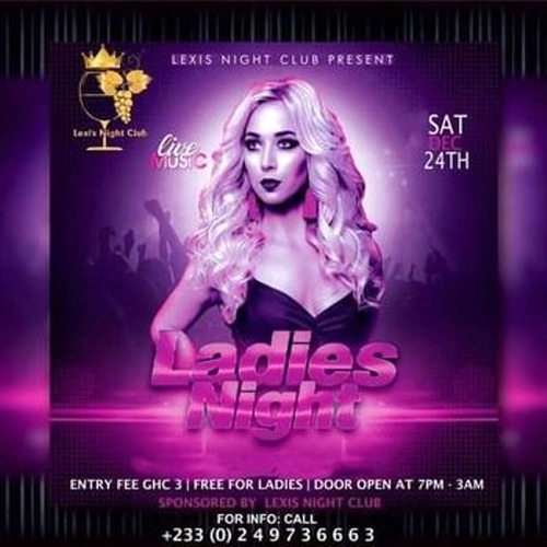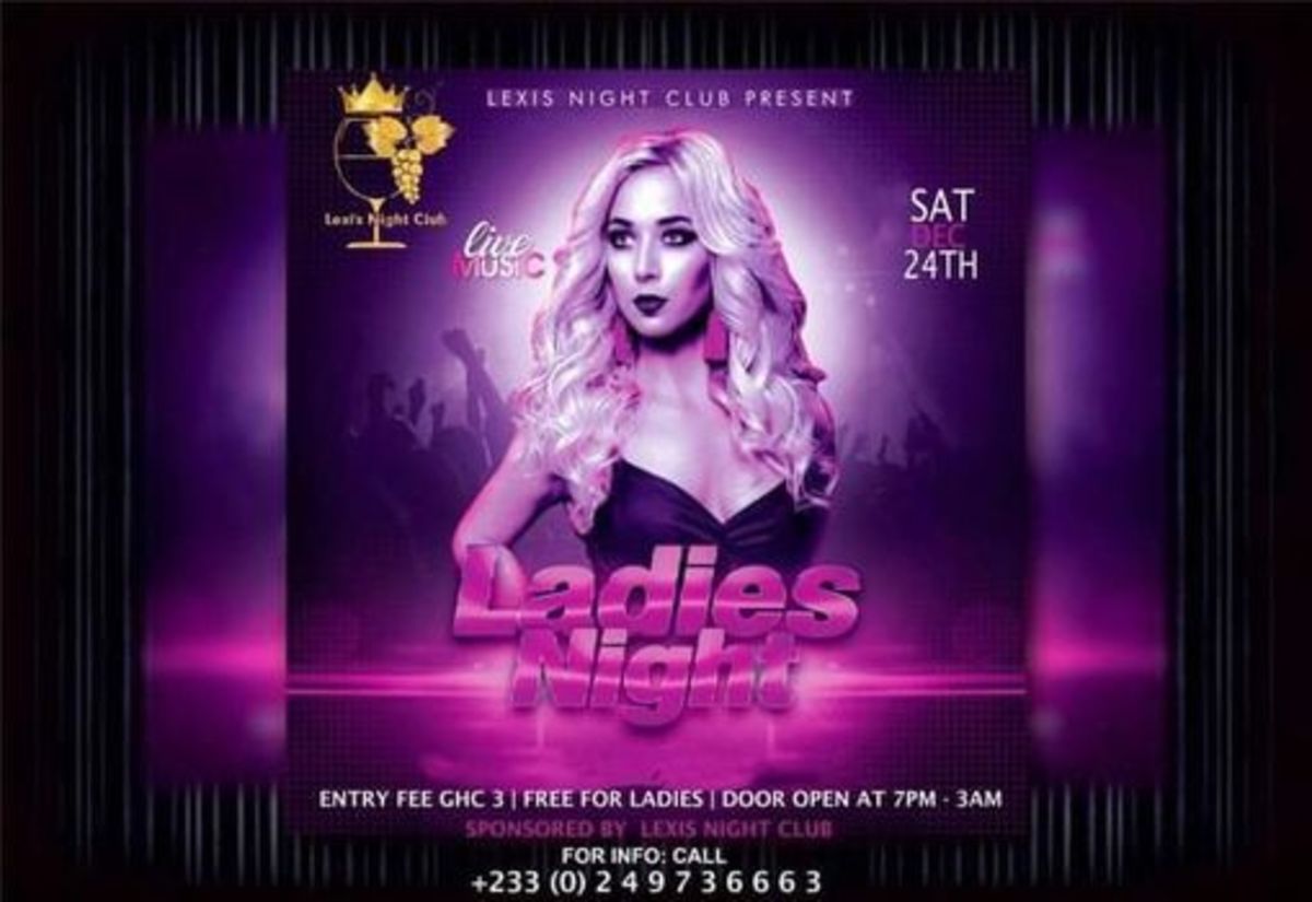 Free for ladies RATE : GHS 3 VENUE: Lexis Night Club, Elubo. TIME: 7:00PM
