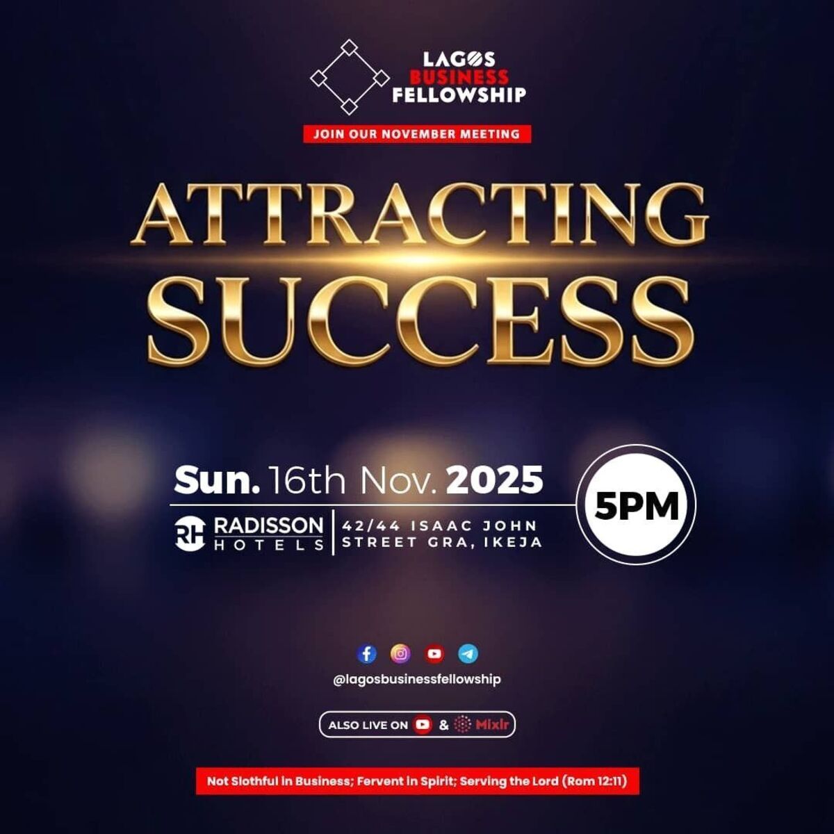 Join us for an inspiring and transformative gathering aimed at attracting success in your career and business. This event promises rich insights, networking opportunities, and actionable strategies to elevate your professional journey. Whether you're an entrepreneur, a business leader, or an aspiring professional, this meetup is designed to empower and connect like-minded individuals in Lagos. Don't miss out on this opportunity to be part of a vibrant community dedicated to growth and success! πβ¨