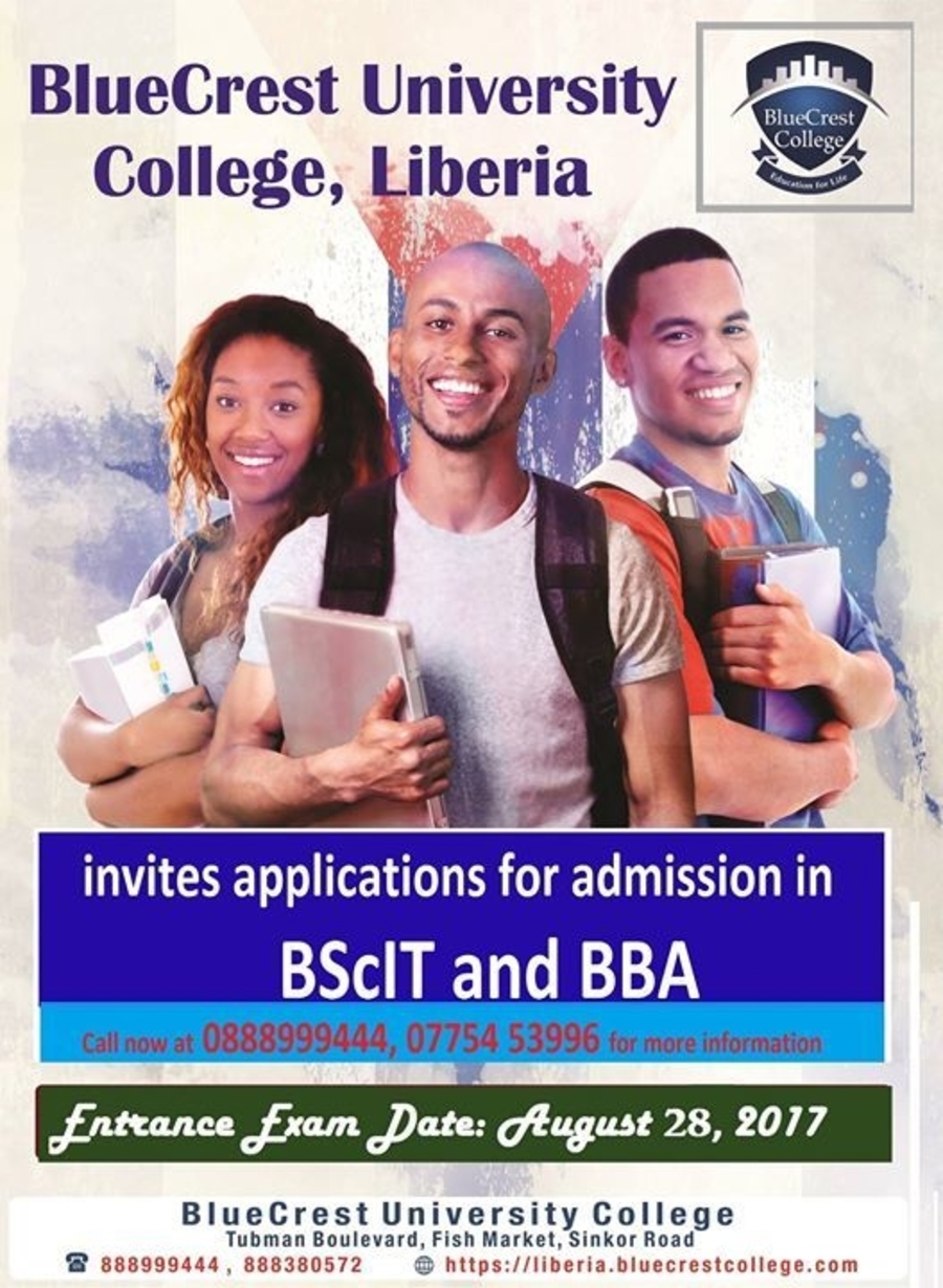 BlueCrest University College, Liberia invites applications for its last Entrance Exam for admission in BBA and BScIT courses for this seesion. The Entrance Exam shall be conducted on August 28, 2017 for Fall 2017 Session.