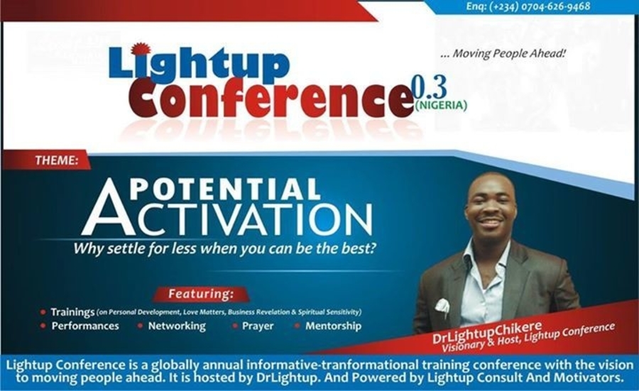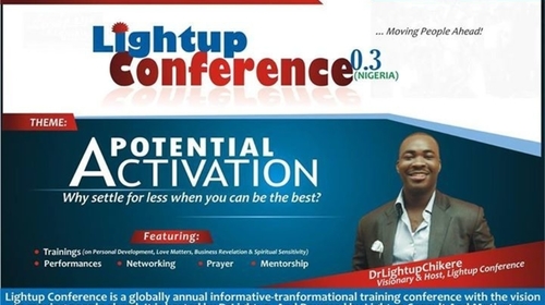 Lightup Conference 0.3 is the thrid edition of Lightup Conference. Lightup Conference is a globally annual informative-transformational training conference with the vision to moving people ahead. It is hosted by Chikere Ugwulebo, O. and powered by Lightup Consult And Motivators.
