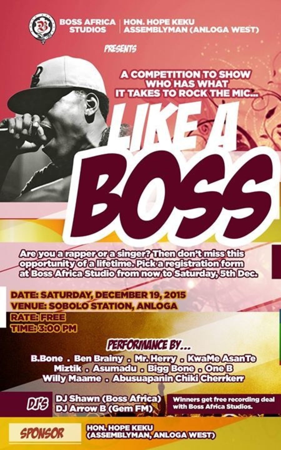 An event to showcase the ability of the youth through music and creativity.if you have what it takes to rock the mic,then contact this numbers Call 0505446113 and 0276993377 or send us an email through bossafricarecords@gmail.com.(BOSS AFRICA)