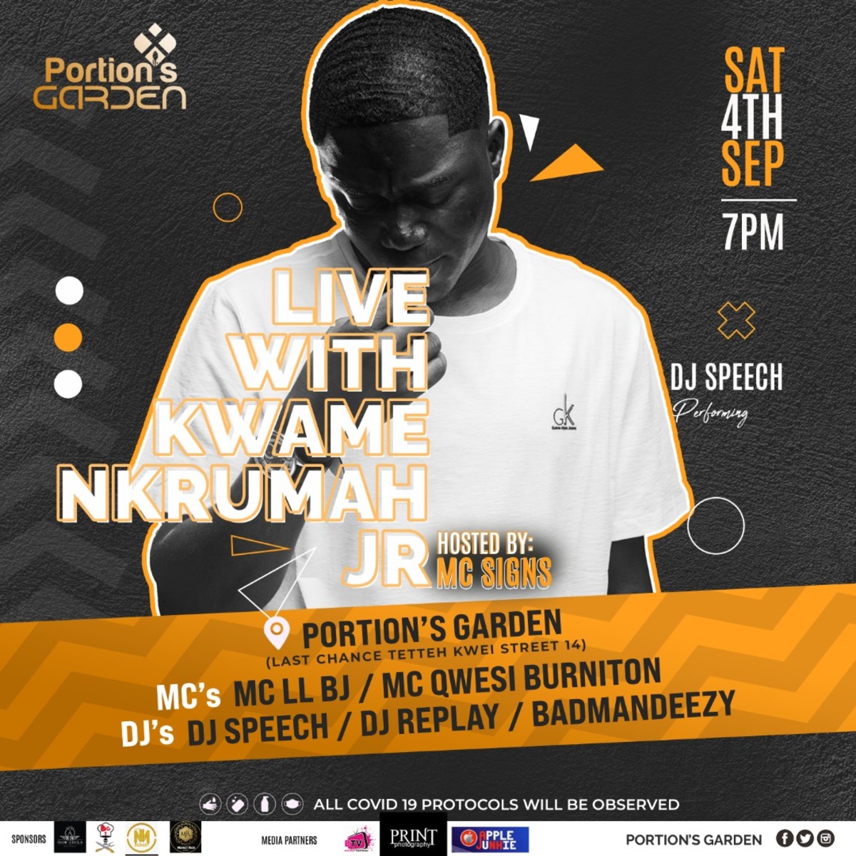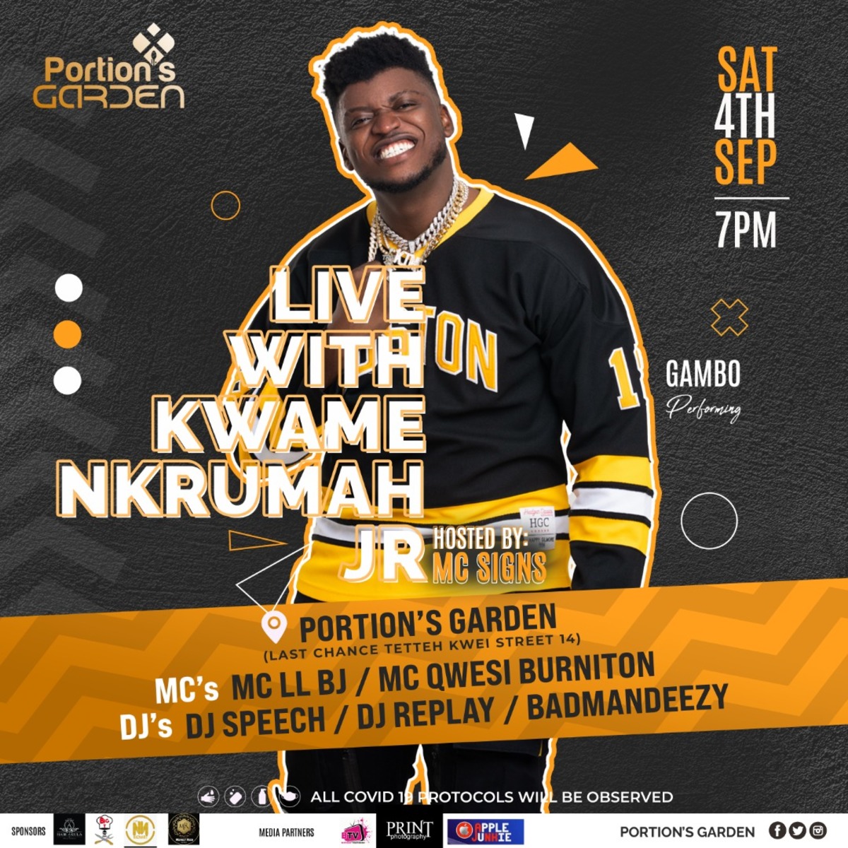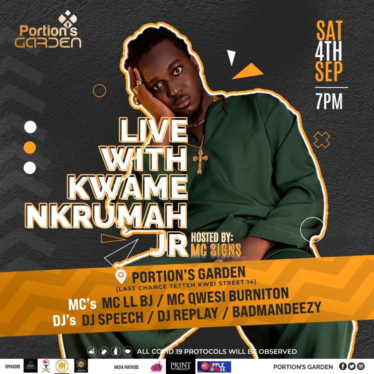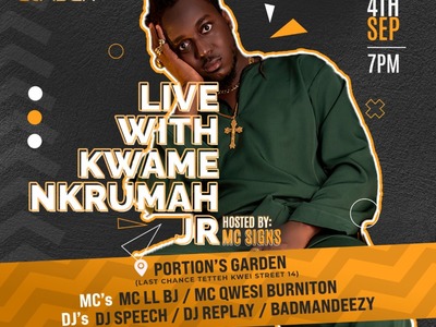 https://smarturl.it/dreams-n-heartbreaks Kwame Nkrumah Jr. Music, presents Live With Kwame Nkrumah Jr.; a concert with the sensational Kwame Nkrumah Jr. performing back to back hits from his newly released impressive music catalogue dubbed, Dreams n Heartbreaks- the EP. Concert features Gyakie, Tulenkey, K.K Fosu, Gambo, Rashid Metal and many other surprise artists. There will be an after party with the stars and the host MC Signs, inside the Portions Nightclub with DJ SPEECH, DJ REPLAY, DJ EMPATHY and BADMANDEEZY behind the turntable.