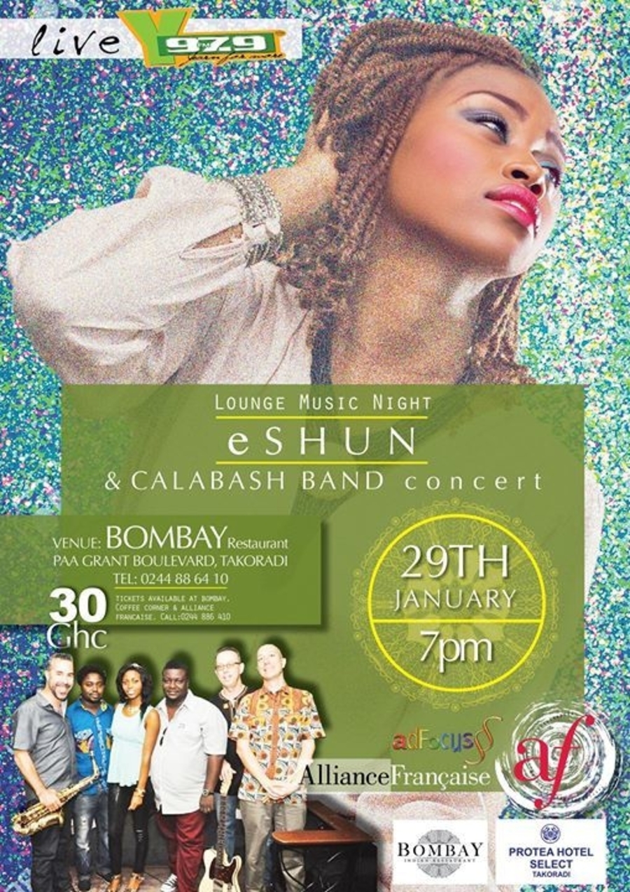 Alliance Francaise presents eShun & Calabash band in live 29th January 2016 7pm @Bombay Indian restaurant at Vodafone road Takoradi Tickets available at Alliance Francaise office, Coffee Corner and Bombay