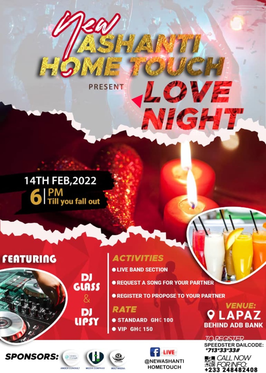 Valentine's day is a day of showing love, book your place for you and your loved ones, and come have fun at the New Ashanti Home Touch Lapaz...