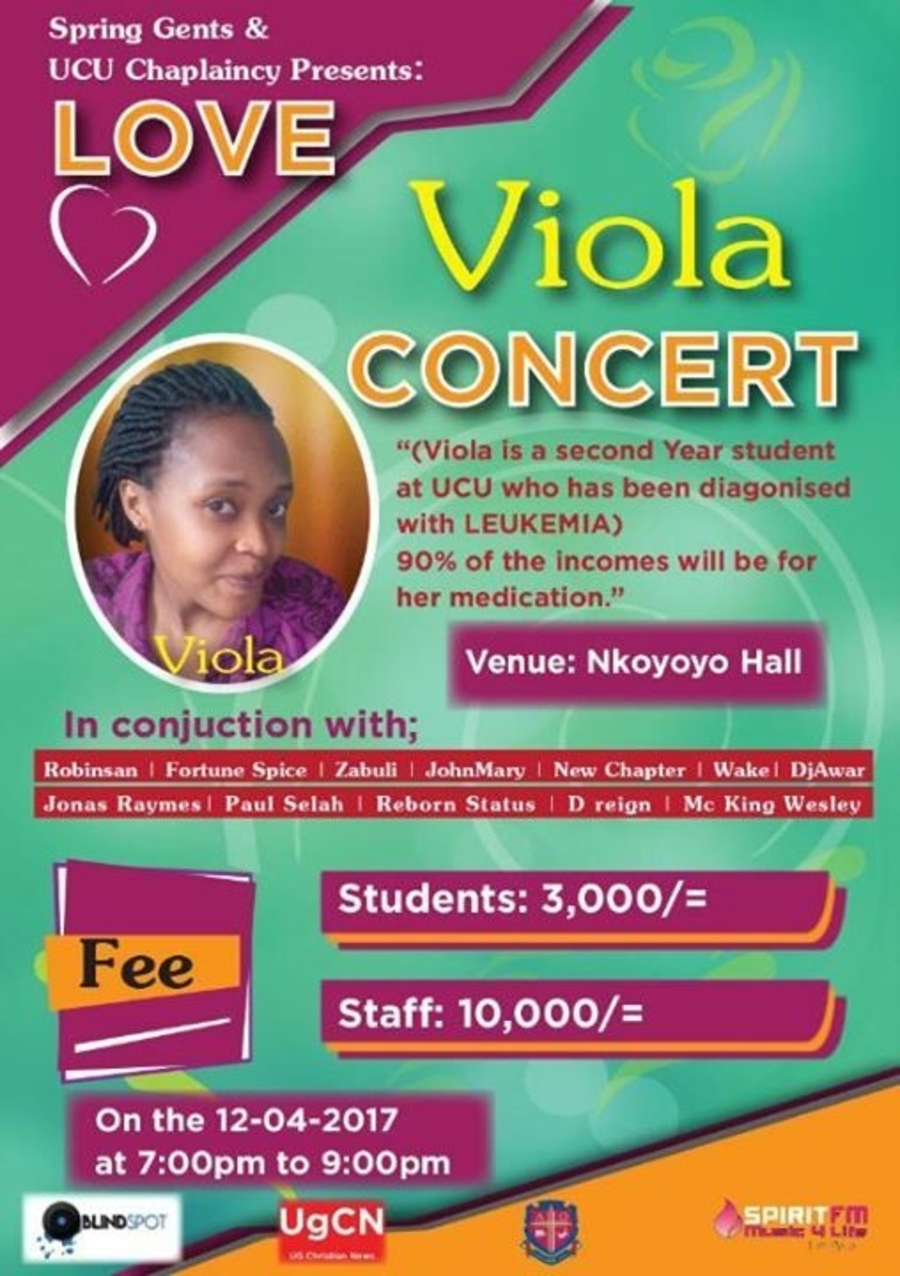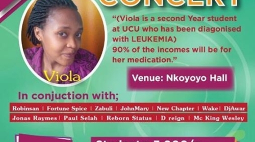 Viola is a 2nd year student at UCU diagonised with Leukemia . Our target is to raise 30,000 USD for her medication. Through this concert we shall share love to her.