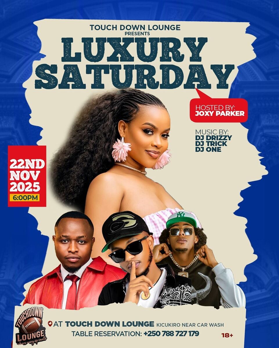 ✨ Experience the city's hottest vibes at Luxury Saturday at Touch Down Lounge in Kicukiro! ✨ Get ready to party in style with top hosts Semuhungu and Joxy Parker, who are set to bring unmatched energy and elegance to the night.