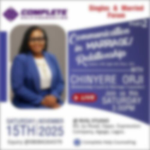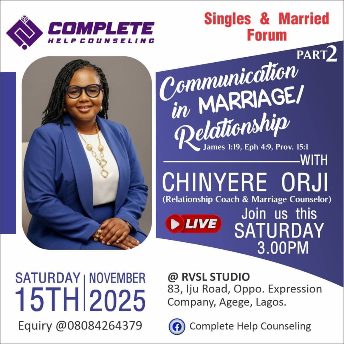 Join Complete Help Counseling this Saturday, November 15th, 2025 at 3:00 PM for Part 2 of our 🔥 Singles & Married Forum — 🎙 “Communication in Marriage/Relationship” with the amazing Chinyere Orji (Relationship Coach & Marriage Clinician).