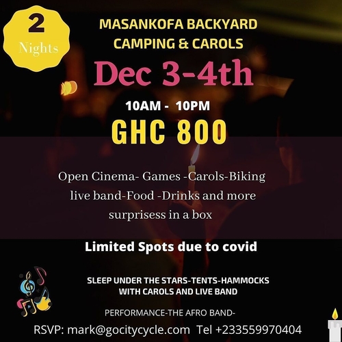 The Masankofa camping and carols is a two-day event in Peduase on the road towards Aburi in the formal Masankofa Hotel, it's going to be having multiple event lineups for 2 straight days offering the options of real tent camping experience and a hotel room stays.