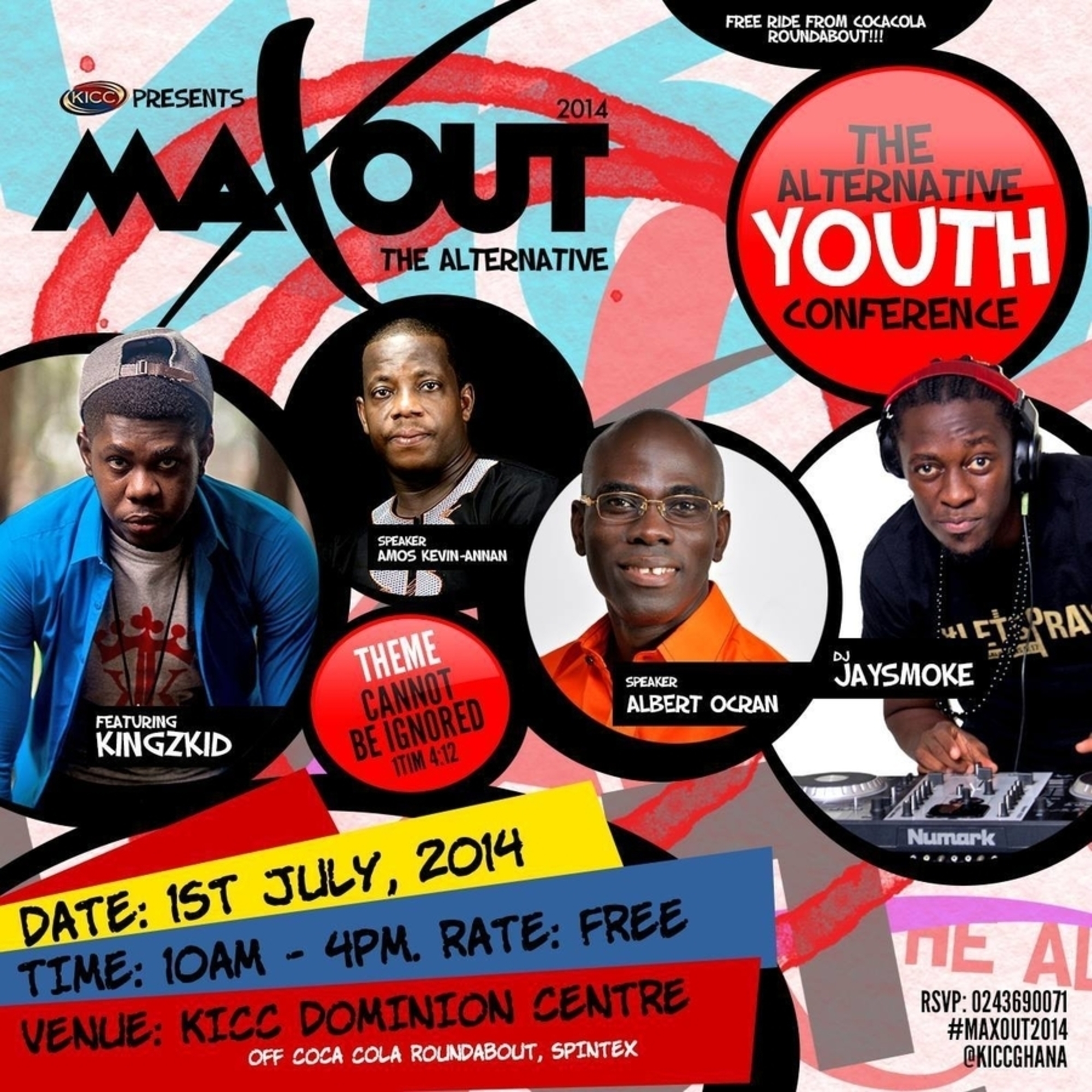 MaxOut is your alternative youth conference organized annually by KICC. This will be it's maiden edition and it's said to feature two of Ghana's upcoming ministers. Kingzkid Musiq and JaySmoke (host of The Sunday Show on Gh One). Also on the bill will be Amos Annan and Albert Ocran. The 'free' event which will start from 10am will run through to the evening. There will be dope urban music from JaySmoke Repjesusent and Kingzkid Nation. Free bus shuttle from Coca Cola Roundabout to the church premises. Just get to the roundabout ;)