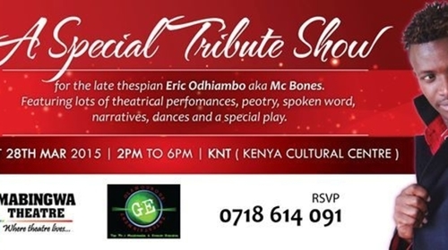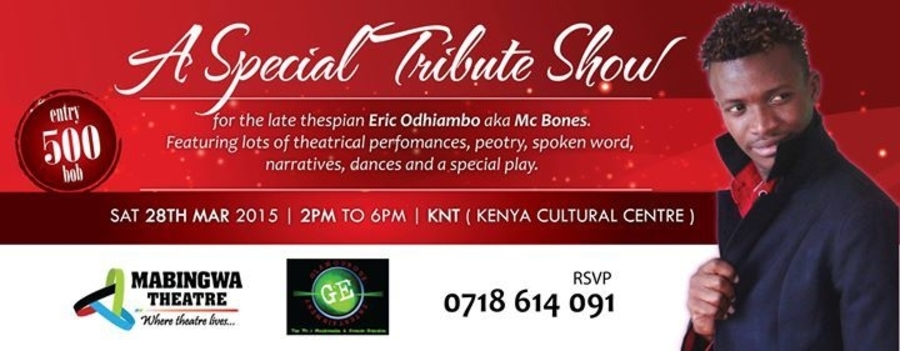 This is a special tribute show in honor of our late brother and fellow thespian, Eric Mabingwa aka MC BONES. There will be a lot of theatrical perfomances ranging from peotry,spoken word, narratives, dances and a play to crown the event....MAKE A DATE WITH US!!!!