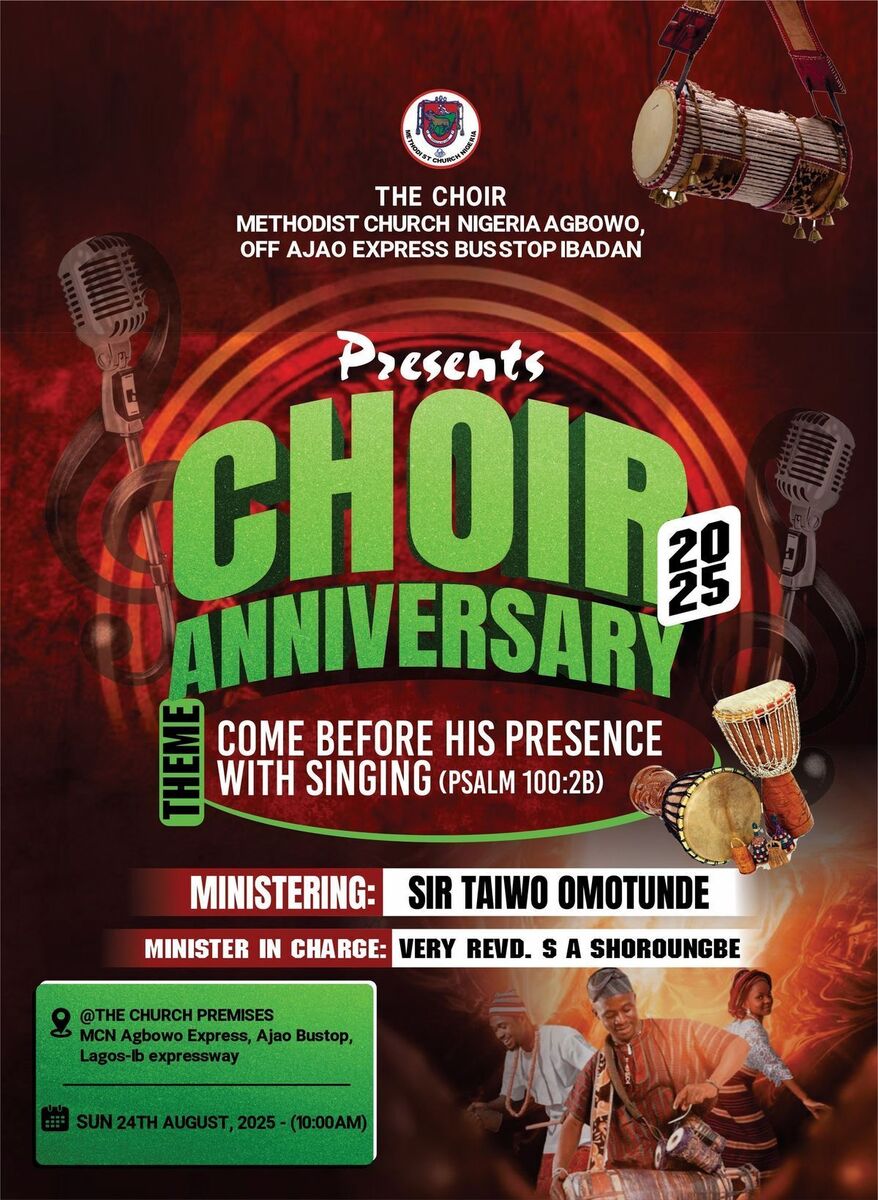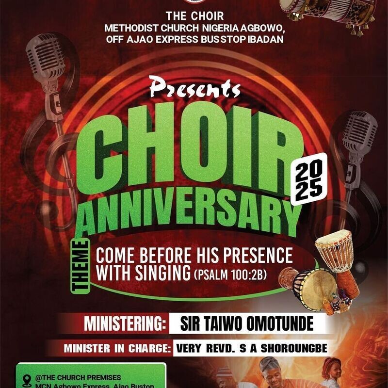 πΆπ Join us as we celebrate a special milestone with the MCN Agbowo Choir Anniversary! This vibrant event promises an evening filled with soulful choir performances, joyful dancing, and spiritual rejoicing. Come with your dancing shoes and be part of a memorable worship experience in the presence of God. Letβs lift our voices and hearts together in gratitude and celebration! πβ¨
