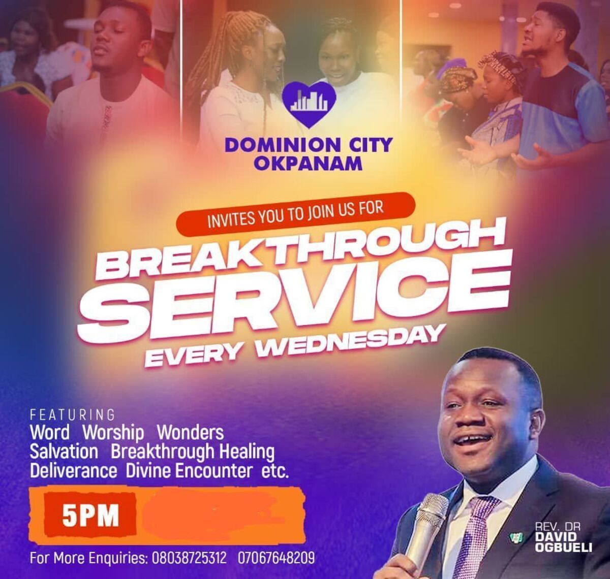 Join us today at 5:00 PM at Dominion City Okpanam for an inspiring and uplifting worship experience. This special Breakthrough Service is designed to launch you into a new realm of God's promises, bringing breakthrough, refreshment, and revival. Expect a powerful encounter with God's presence that will lift every burden and set you on the path to your breakthrough. Don’t miss this divine moment to be revived, renewed, and recharged in His presence! ✨🙏