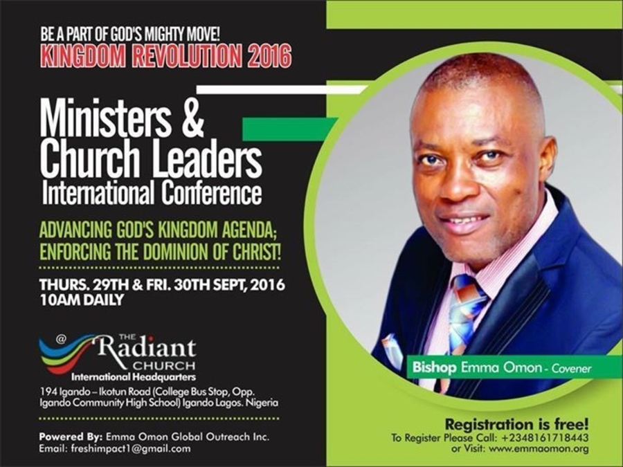 REGISTER NOW! Registration is FREE and REQUIRED for Seat Reservation! Kingdom Revolution MINISTERS & CHURCH LEADERS INTERNATIONAL CONFERENCE is an annual event with the objective of Empowering and Equipping Ministers of the Gospel and Church Leaders for Effective Ministry In Changing Times! At a time when so many false prophets have infiltrated the church, and there’s so much Confusion, Strife, Division, and Conflicting Doctrines, Errors and Deceptiion among Churches and Ministers of Gospel, the Conference serves to give clarity and relevant answers to many of the thorny questions and doctrinal conflicts besetting the Gospel Project. At a time of Apostasy, when many Ministers are facing the temptation to substitute the Gospel with JUNKS, the Conference serves to point Ministers of the Gospel back to Jesus Christ and His Finished Work of Redemption. The Conference serves to provide balanced understanding of the “Doctrine Of Christ”, the “New Testament Ministry” and the much abused, misinterpreted and misused “Doctrine of Grace”. The Conference also serves to help participants gain proper understanding of the KINGDOM CONCEPT AND STANDARDS FOR EFFECTIVE MINISTRY in the New Testament Dispensation. Most importantly, the Conference serves to Empower participants with adequate knowledge and Spiritual Gifts for Supernatural Ministry so as to be able to win more souls to Christ and take more territories for the Kingdom of God! If you are a General Overseer, Apostle, Bishop, Prophet, Pastor, Evangelist, Teacher, Minister, Elder, Deacon; Bible School Student or Church Leader, this Conference us for you! To REGISTER and RESERVE Your Seat, Click on this link: http://eepurl.com/ccGjbL We welcome Participants from around the world to this great event. All intending participants residing outside Lagos or Nigeria who need assistance with arrangements for safe, affordable and comfortable accommodation and ground transportation from the airport should please contact our protocol dept by sms or call: +2348161718443 (10AM - 5PM GMT+1, MON - FRI) or email: freshimpact1@gmail.com. For more info, Please visit www.kingdomrevolution.net