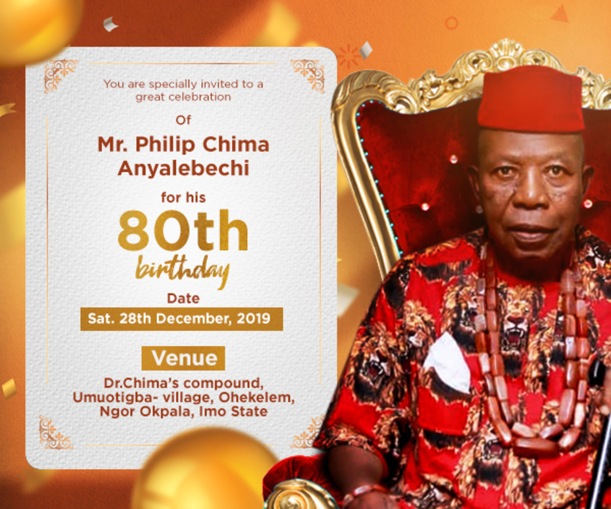 You are specially invited to a great celebration of Mr Philip Chima Anyalebechi for his 80th birthday.