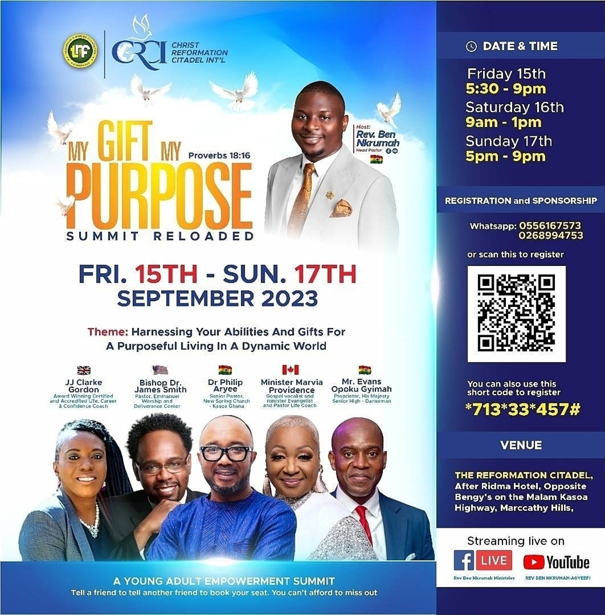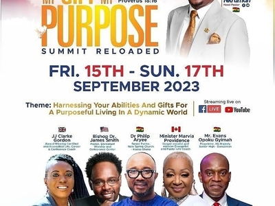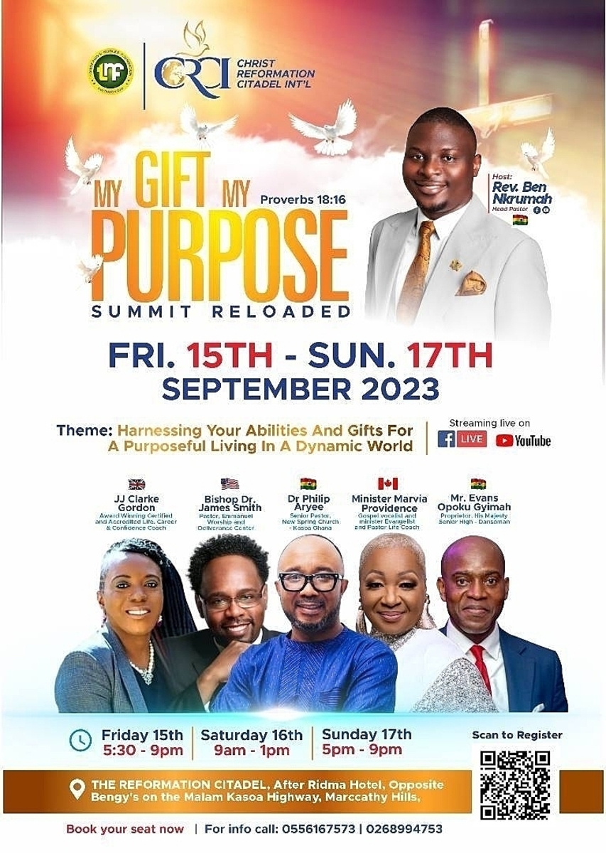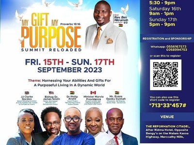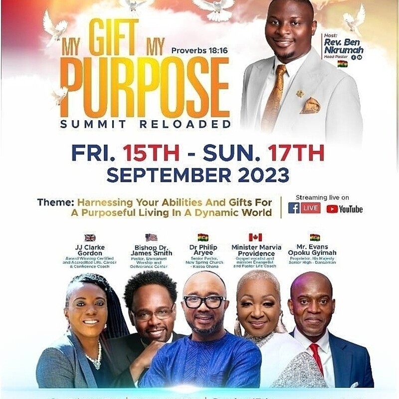 MY GIFT MY PURPOSE is the brainchild of Rev Ben Nkrumah-Agyeefi. A Young Adult Empowerment conference organized by Tomorrow's Nobles Foundation in collaboration with Christ Reformation Citadel. It serves as a platform where the young generation and anyone who wish to find themselves, pursue purpose and thrive in entrepreneurship in this dynamic world will be empowered to harness their Gifts, Talents, and Abilities for a purposeful living.