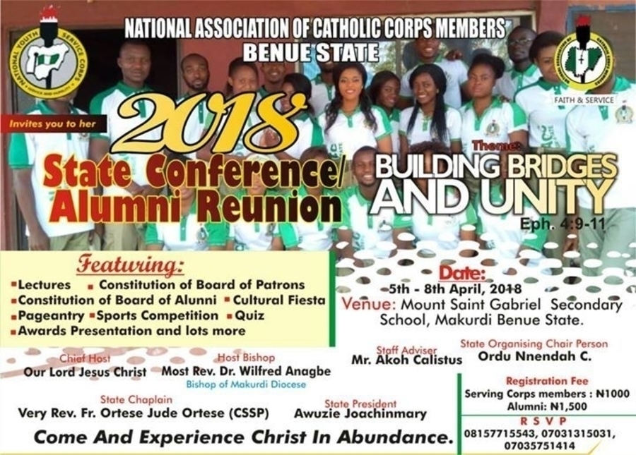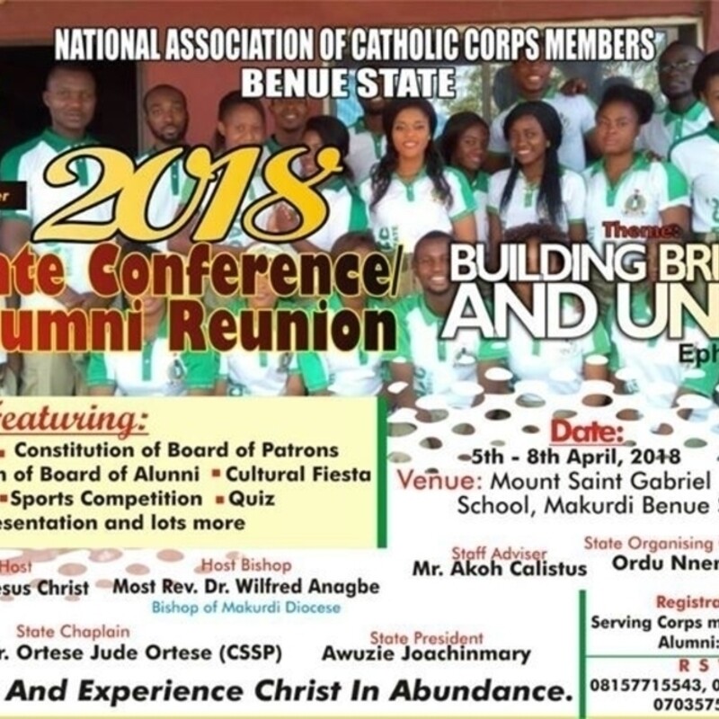 NACC Benue state cordially invites all Catholic Corpers and Alumni Members to her State Conference scheduled as Follows: