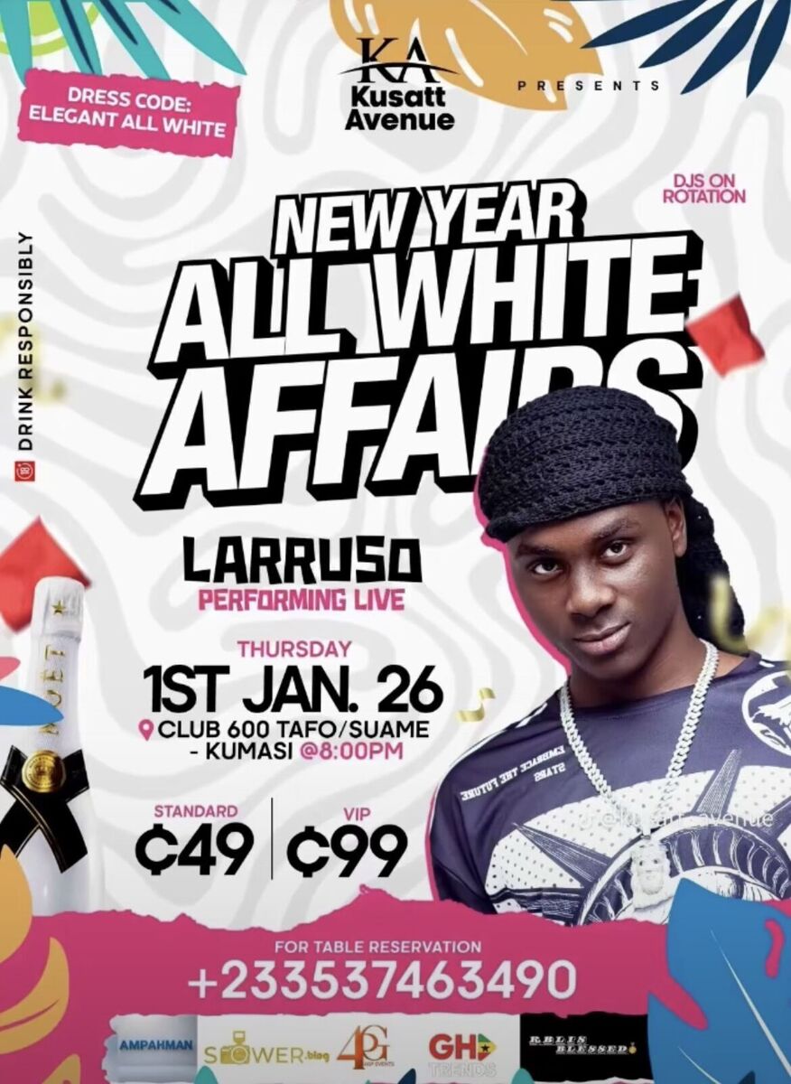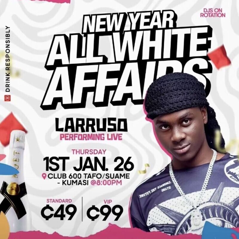 Kusatt Avenue presents “New Year All Party Affairs” with Larruso live in performance. Event going down in club 600 Tafo/Suame - Kumasi.