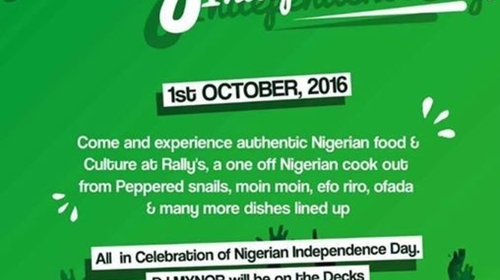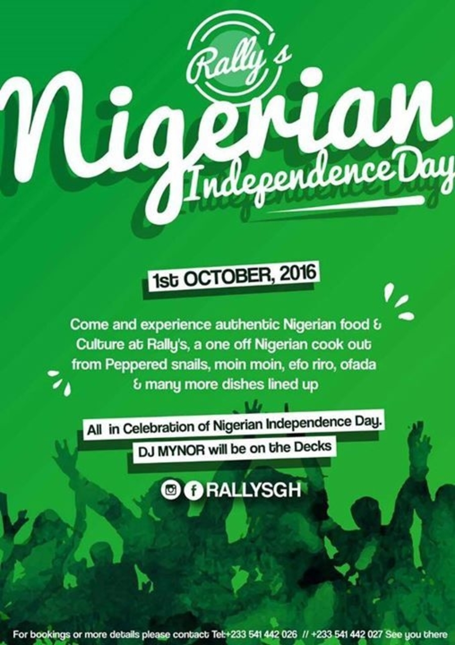 We are happy to have a great selection of Nigerian dishes to celebrate Independence Day. It's an all day affair bring your friends and family. We will have our own DJ Mynor on the decks. For more info call 0541442026