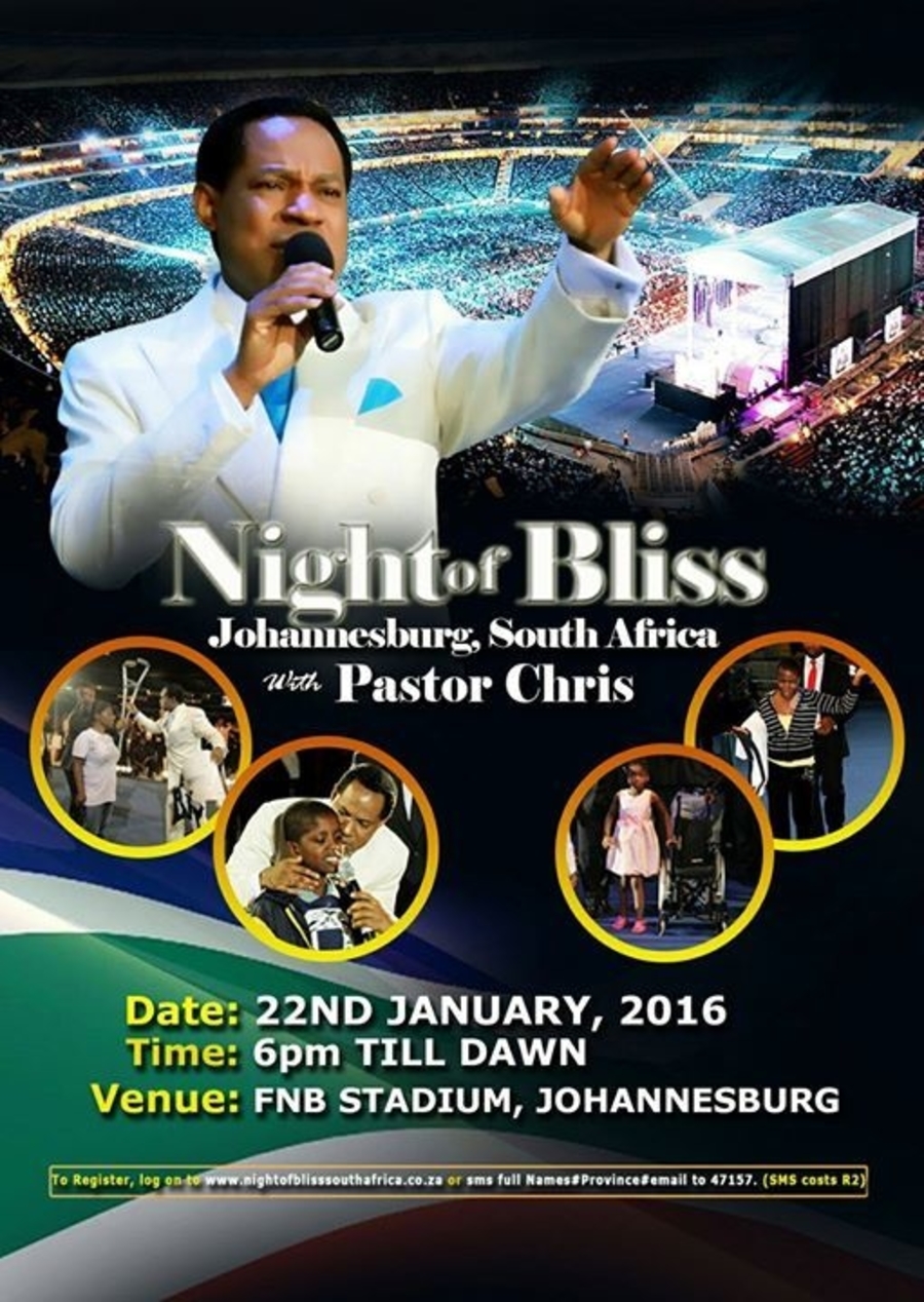 "We have NOB JHB on 22 January 2016. Don't miss it. We are bringing to you a special grace and special anointing of God's spirit. It's coming to you from the Lord. The presence of God will be there. Your life will take on a new level from that night till morning. It is one but special night. The dew of heaven will come on you that one night and you will never be the same. It is one opportunity like no other. Tell everyone you can tell to come. It will be a manifestation of Jesus Christ. It is God's timing for you. God's moment to bless you."