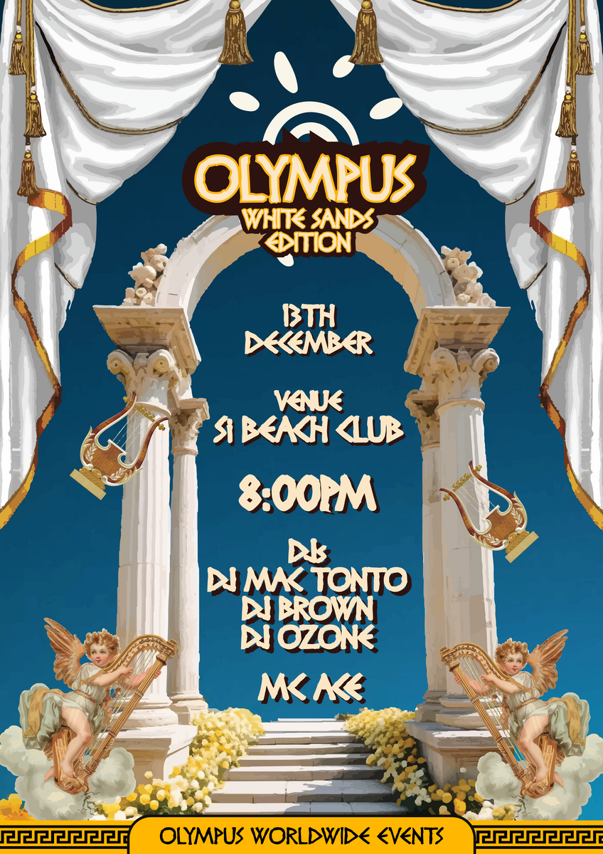 Free Drinks, Loud Music and energy matching 24/7, Come Ascend to Olympus with us on the 13th of December at the Si beach club at 8pm, Theme is Santorini white and remember to dress to impress