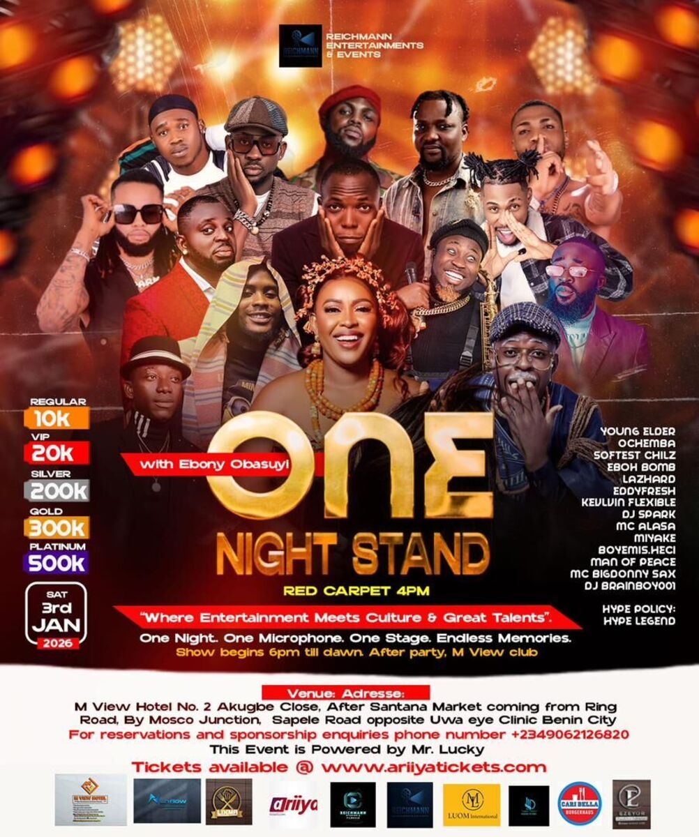 Prepare for an unforgettable evening at One Night Stand with Ebony Obasuyi! This is set to be the biggest entertainment night of the year in Benin City, featuring a spectacular lineup of Nigeria’s finest entertainers. Hosted by the dynamic Ebony Obasuyi, the event promises non-stop laughter, captivating music, stunning fashion, and vibrant culture. With performances by talents like Eboh Bomb, Mc Alasa, DJ Spark, and many more, it’s a night of endless memories with one microphone and one stage. Don’t miss the powerful performances and electric vibes that will keep you entertained till dawn!