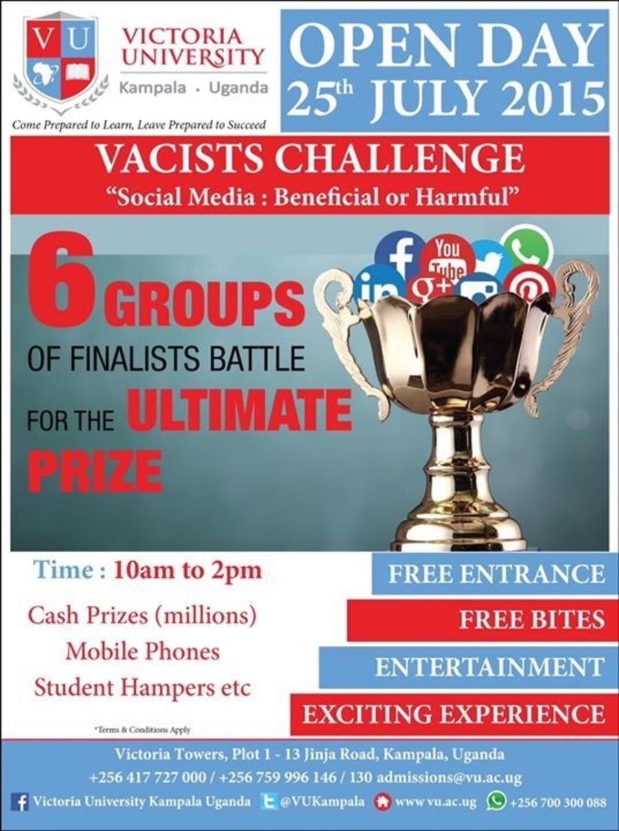 The Vacists Challenge: 6 GROUPS OF FINALISTS BATTLE FOR THE ULTIMATE PRIZE. Date 25th July 2015. Time:10am to 2pm, Cash Prizes (millions), Mobile Phones, Student Hampers etc Free Entry..... Call us on : +256 417 727 000