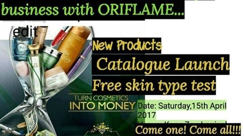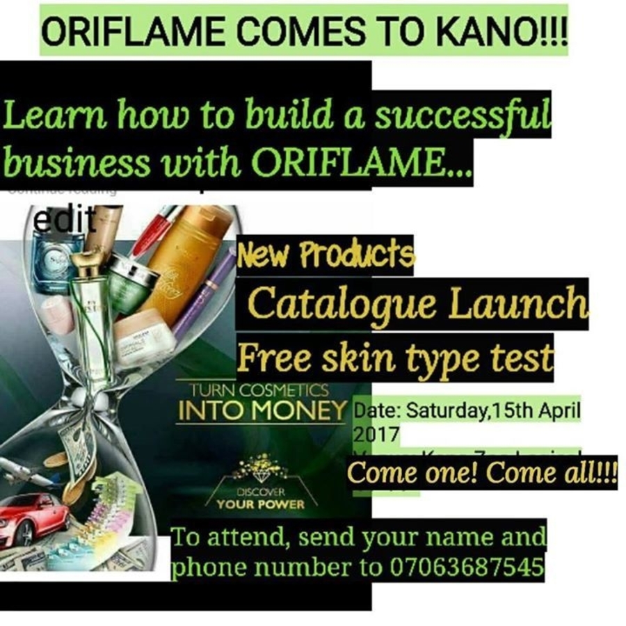 Hello, Industrious people of Kano! Join us on 15th April, 2017 as we Launch our new Catalogue and new products and learn how to start a successful business with Oriflame. ~Product testing ~Special gifts ~Special Skin care Consultation.