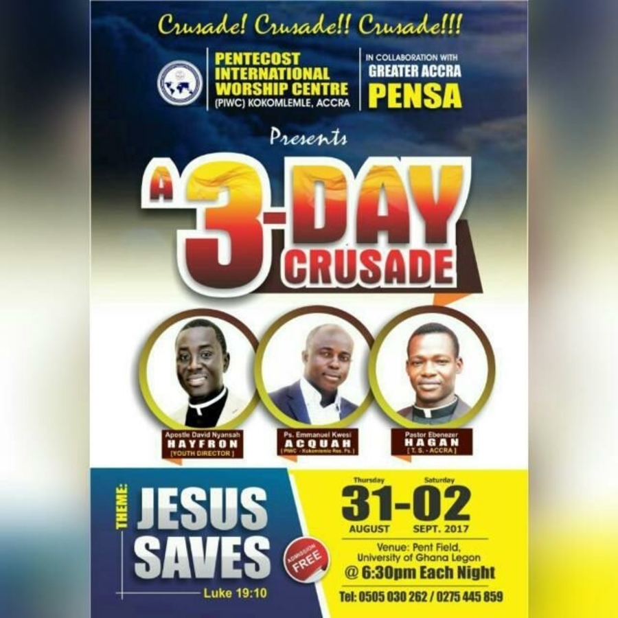 The Pentecost Students and Associates, Greater Accra Pensa in colaboration with Pentecost International Worship Centre (PIWC) Kokomlemle, presents the Saving Jesus crusade dubbed Jesus Saves.
