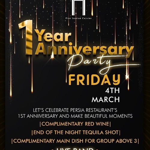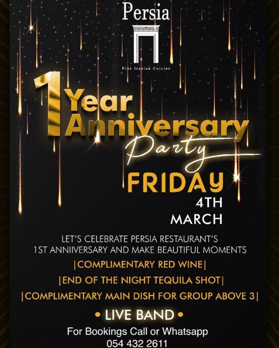 Let’s celebrate Persia’s 1st anniversary with us & make your every moments more beautiful at Persia restaurant. Let’s make your lovely time memorable & enjoy with our special live band with special persian cuisine … we will expecting you @persia don’t miss out Contact for booking +233 54 432 2611 persiarestaurant.gh@gmail.com
