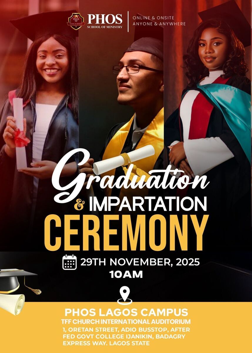 π Celebrate achievement and new beginnings! Join us for the graduation ceremony of Phos School of Ministry, a momentous event filled with inspiration, spiritual impartation, and community celebration. Witness the culmination of dedication and faith as graduates are honored in a vibrant atmosphere of joy and hope. Expect engaging speeches from our President, Dr. Sam Chiaka, uplifting worship, and heartfelt congratulations. This is a perfect occasion for friends, family, and supporters of spiritual growth to come together and be part of a memorable milestone. Don't miss out on this empowering event that promises to uplift your spirit and ignite your purpose! πβ¨