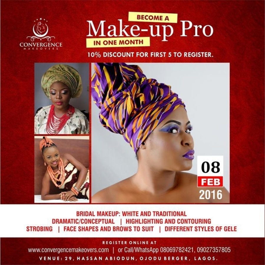 Register at http://convergencemakeovers.com/makeup-gele-training/ or call 08069782421