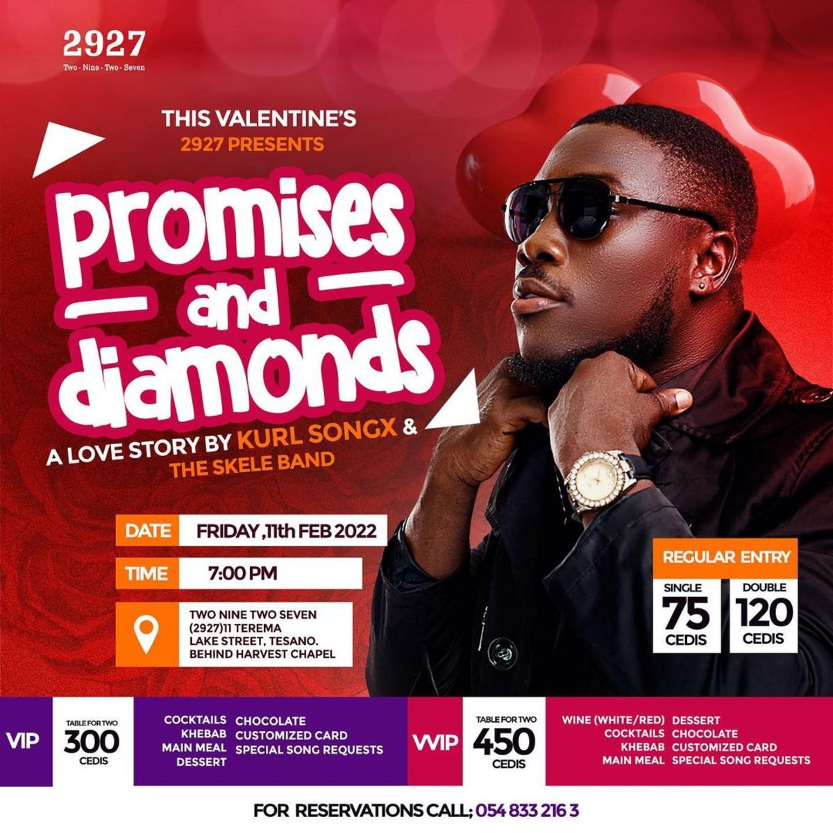 It’s here! PROMISES & DIAMONDS😍 It’s the MONTH OF LOVE already and we @2927_tesano have thought about you! ❤️ Together with @kurlsongx & the Skele Band, we will be bringing to you a Special dinner & live band under the stars✨ on Friday, 11th February,2022. Come on it’s Val’s season!🙈