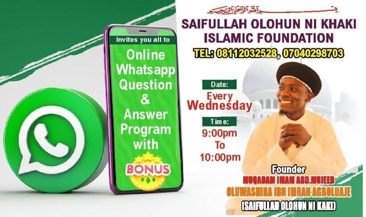 Join us for an enriching and interactive session of Question & Answer coupled with an exciting Giveaway event! Hosted by Saifullah Olohun Ni Kaki Islamic Foundation, this weekly online program provides a platform for spiritual growth, knowledge sharing, and community engagement. Participants will have the opportunity to ask questions related to Islamic teachings and receive insightful responses. Plus, donβt miss out on the chance to win exclusive giveaways! Connect effortlessly via WhatsApp and share with others to spread the benefit! π