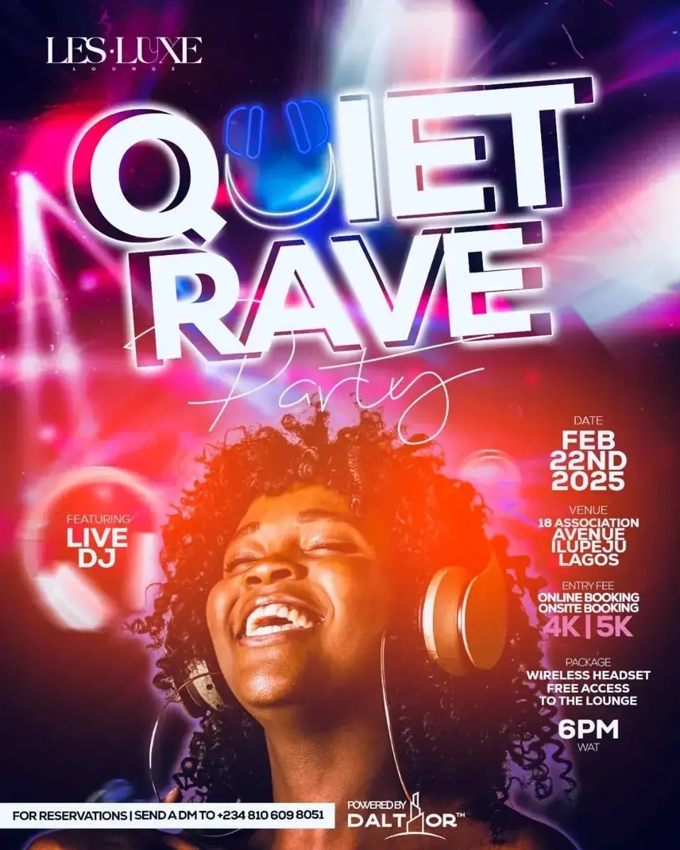 Mark your calendars for February 22, 2025, and head to 18 Association Avenue, Ilupeju, Lagos, for a night of non-stop vibes, bass-thumping beats, and the best silent party in town!