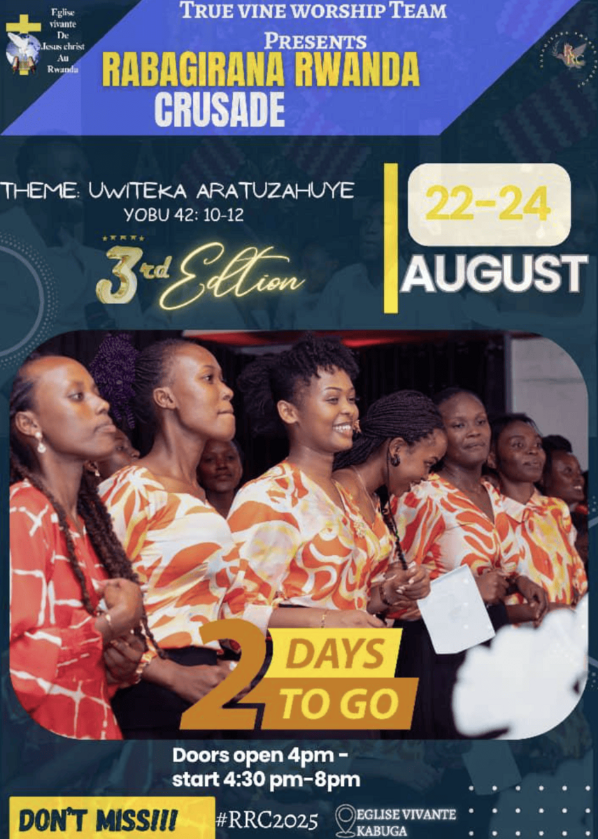 Get ready for a life-transforming encounter at the Rabagirane Rwanda Crusade – 3rd Edition, presented by the True Vine Worship Team under Eglise Vivante de Jésus Christ au Rwanda. 🎉