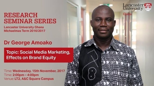 Our next Research Seminar will be delivered by Dr George Amoako on topic: Social Media Marketing, Effects on Brand Equity. Join us in LT 2 at 2pm!